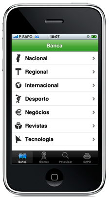 Aqui a malta lançou hoje, ou melhor, a Apple permitiu que a malta lançasse, aquilo que me parece ser, apesar das notícias oportunamente vinculadas por outros indiciarem o contrário, a primeira aplicação nativa feita em Portugal para o iPhone e disponível a AppStore. É o SAPO News, tem a Banca de Jornais, as Notícias e a Pesquisa e pode estar gratuitamente nas mãos dos 10000, perdão, 3500 utilizadores de iPhones que existem em Portugal.