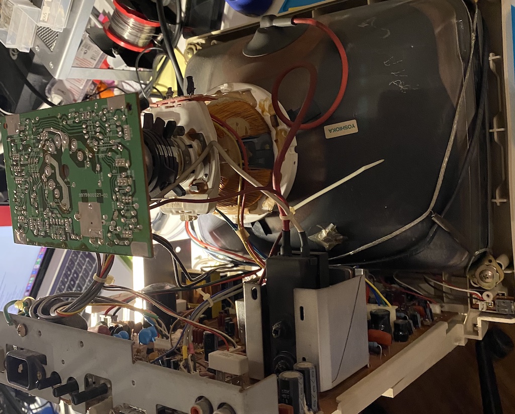 Disclaimer: CRTs can hold thousands of volts in their flyback circuits. If you don’t know how to discharge the tube or what you’re doing in general, you should not even take the plastic cover off. A CRT that has been powered off for an extended period won’t be safe either, as it builds static over time. Also, there are high-voltage capacitors in the electronics that, depending on whether there are bleeding circuits, can hold energy for a long time.