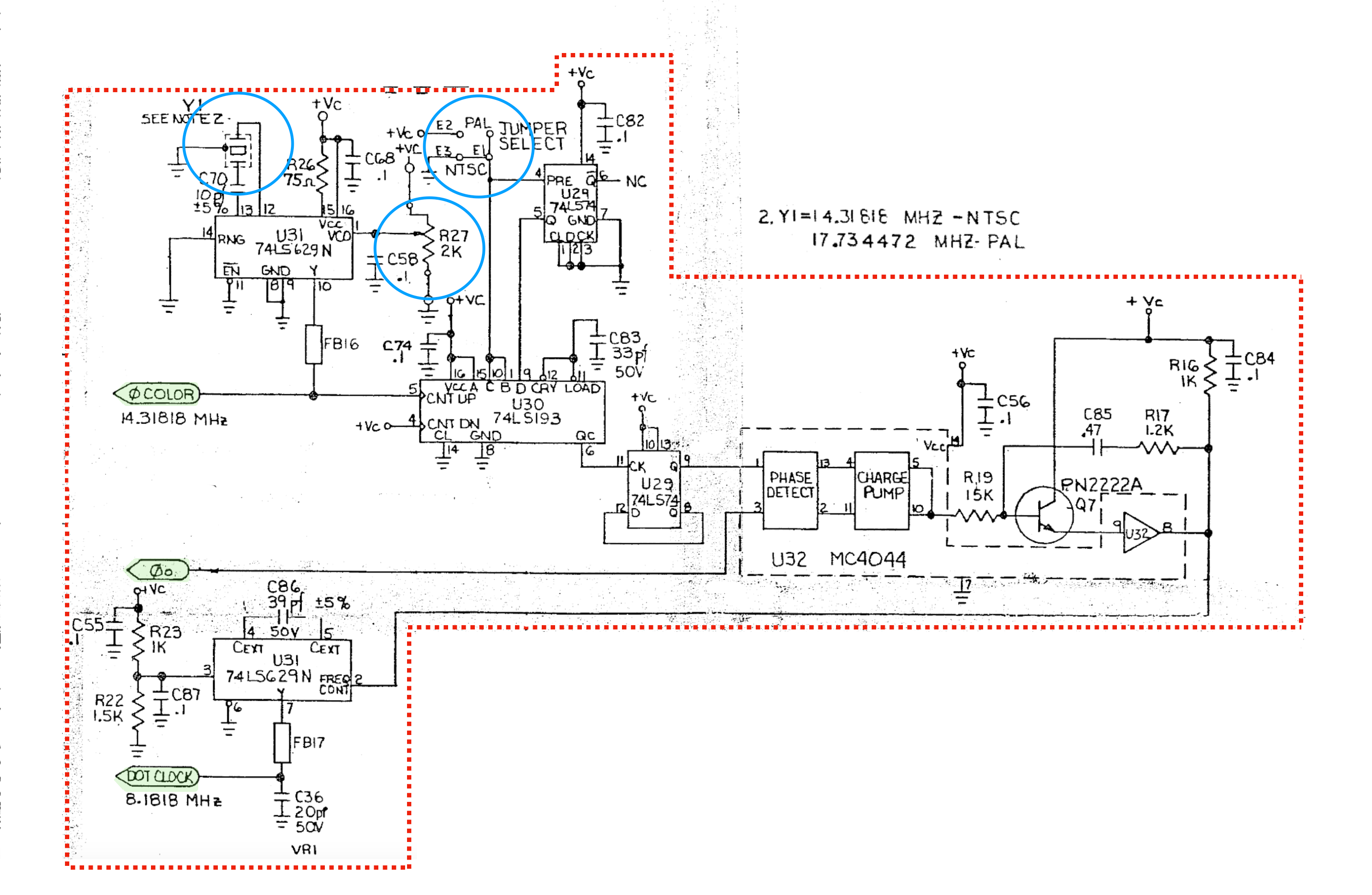 Next up, I started replacing everything I could: the crystal oscillator, the MC4044, the 74LS193, the 74LS629, the 74LS74, and the 2222A transistor. Still, no luck.