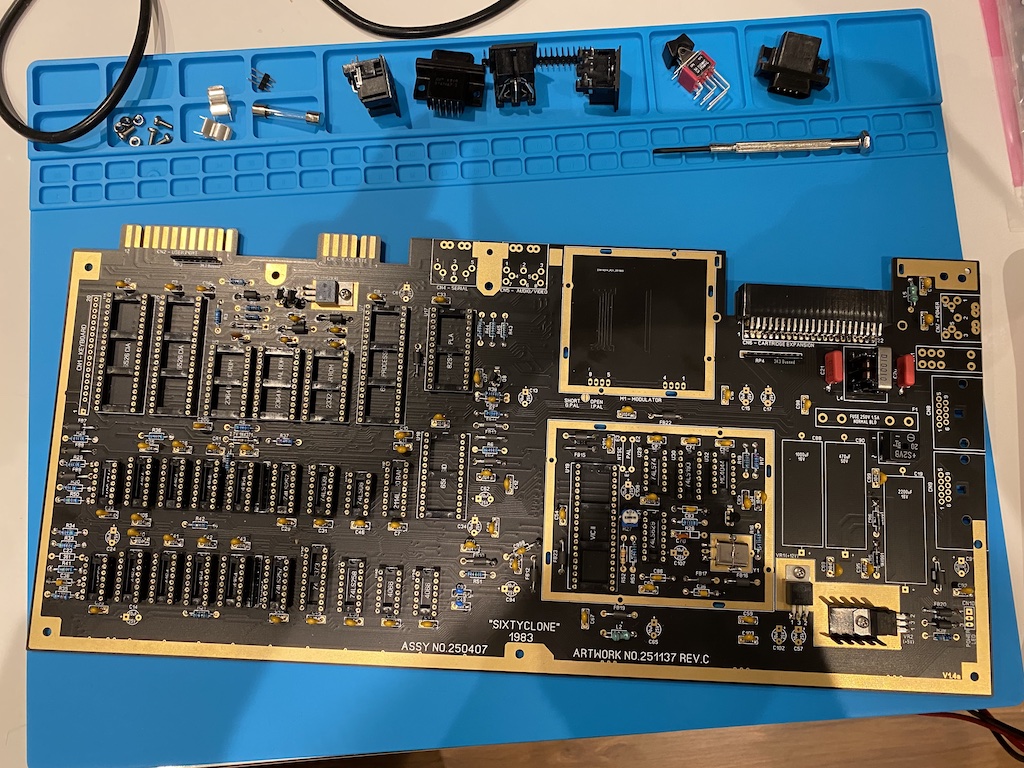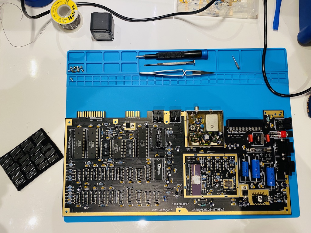 Finally, let’s populate the big electrolytic capacitors, the rest of the connectors, and an RF modulator from an old board (I will replace this later) and squeeze all the ICs into their sockets.