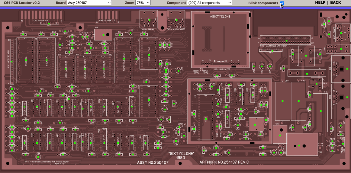 A great resource to keep open on a browser tab while assembling your board is the C64 PCB locator; you can use it to choose your board revision, select any component and make it blink, and find where and how it fits in the PCB.