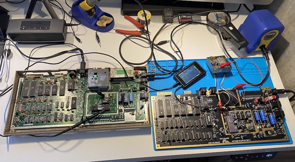 The video is out-of-sync for some reason, but I think I can see the boot sequence and the blinking cursor in there if I try hard. This tells me that the important stuff, power, CPU, RAM, ROMs, PLA, and CIAs, are all working, and that’s a big win for me already.