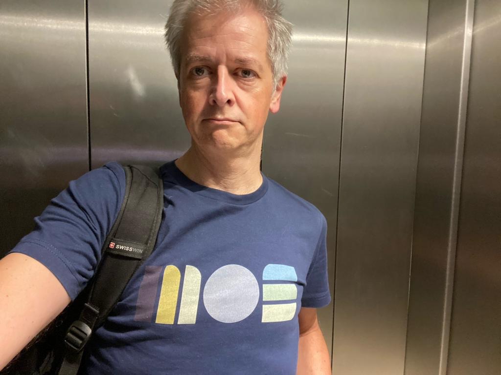 Me, my MOS tee and a backpack packed with retrocomputing gadgets, ready for Inércia.