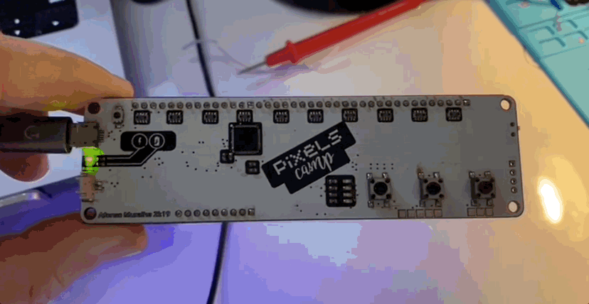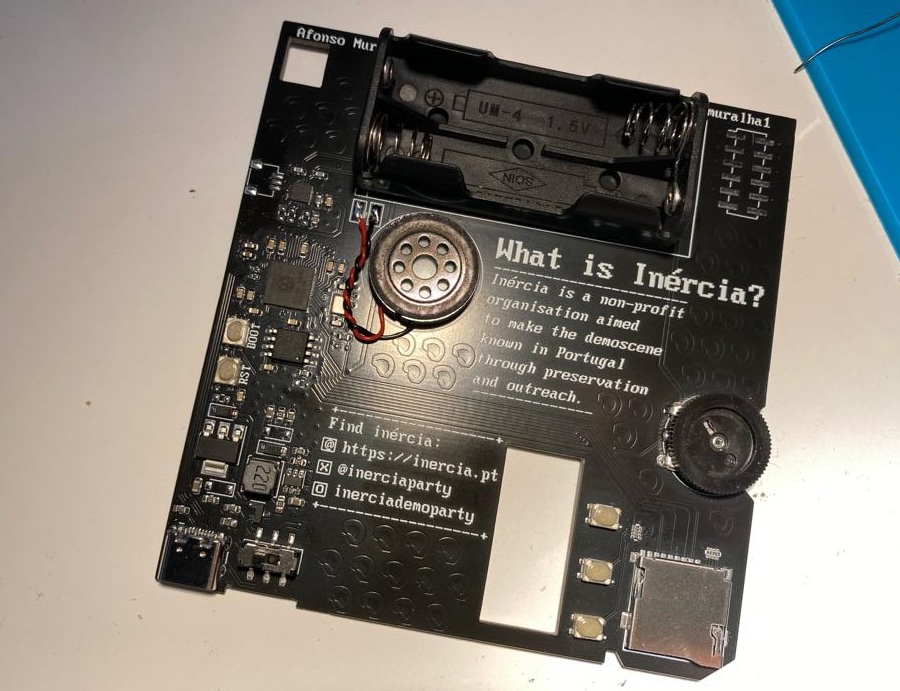 Finally, I reconnected with Afonso Muralha. I’m a massive fan of Afonso’s work. He was a Pixels Camp habitué, and in 2019, he built us a prototype of a beautiful LED matrix display PCB badge. This year, he went all in into the badge life and designed 30 PCB badges for the winners of the Inércia event. The badge has a 3½-inch floppy disk form and boasts an entire computer around an RP2-B2 ARMCortex-M0 microprocessor with GPIO pins, USB-C, mass storage, and even a speaker. If the reference sounds familiar, the same chip powers the popular Raspberry RP2040; that’s why, Afonso kindly gifted me one of the Inércia badges.