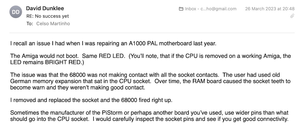 Why doesn’t it work without the PiStorm? I couldn’t figure it out. Then, I started exchanging emails with David Dunklee, the author of a modern Amiga 1000 expansion board called Parceiro, which I will discuss later in this blog post. David was unbelievably patient and helpful. He sent me multiple emails with tips and detailed step-by-step instructions on what to test and how to do it.
