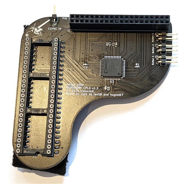 But there’s a problem: RGB2HDMI was designed for 3-bit (8 colors) RGB output, not 12-bit (4096 colors) like the Amiga. However, there are now options to make it work with 12-bit color systems. Specifically, I can build this Amiga 1000 CPLD Adapter that takes the necessary signals from the Denise video chip, syncs them, and feeds them to the onboard Pico running the RGB2HDMI image. No power supply and minimal soldering are required.