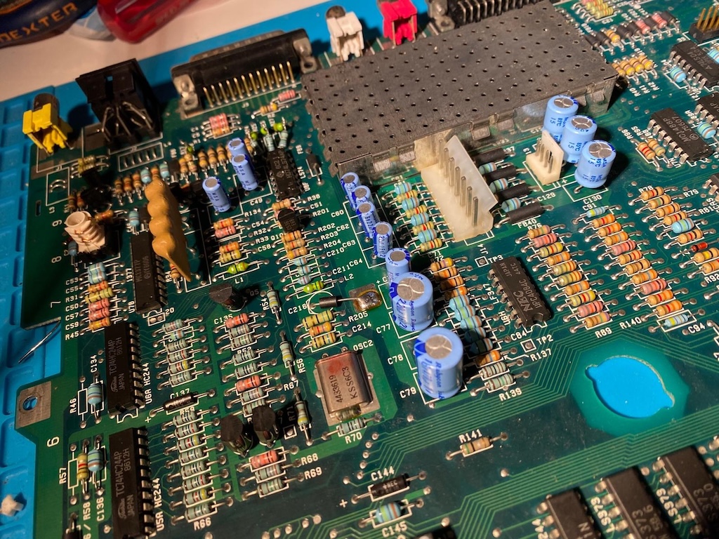 The first thing that comes to every retro-enthusiast’s mind when a machine isn’t working is replacing its capacitors—recapping, as it’s called. Electrolytic capacitors have a limited lifespan and tend to leak or dry out over time, causing all sorts of issues to old computers. I don’t see any leakage, but maybe this will help solve the problem. Either way, it’s always good practice to do it. So, I ordered a complete set of capacitors from Mouser Electronics, armed myself with my Hakko FR-301 desoldering gun, and started the job.