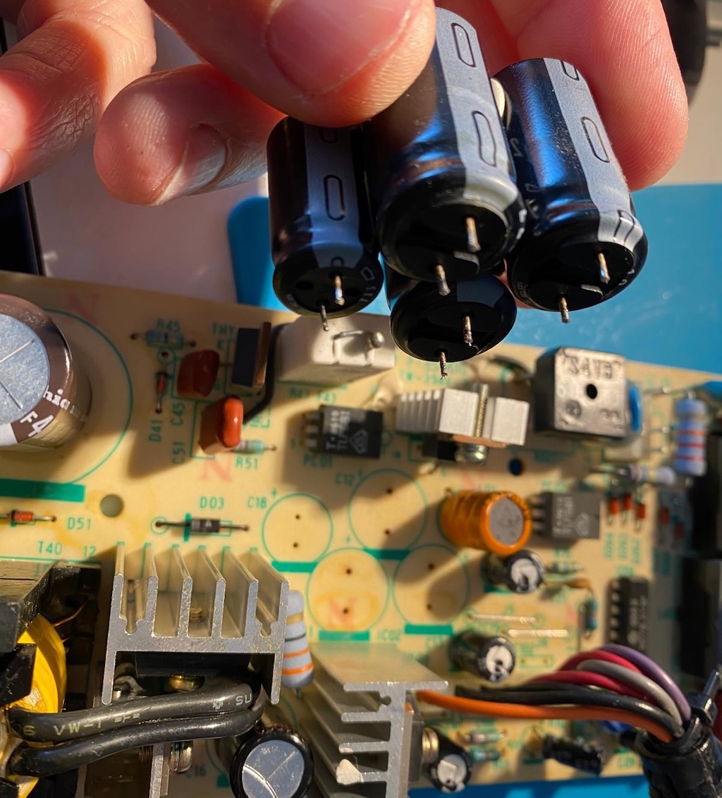 I replace both the motherboard and the PSU capacitors. Some of them don’t quite fit the holes because either the specs aren’t 100% exact (you can typically use equivalents if you respect the minimum voltage and tolerance), or, guess what, capacitors with the same specs have better quality and are smaller now. So I must bend the legs a bit, but it’s all good.