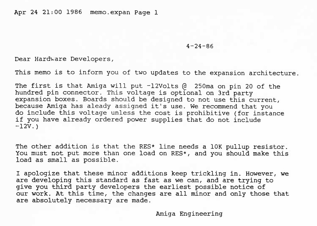 In fact the Amiga 1000 had a few board revisions after launch. Look at this delicious note from Amiga Engineering in ‘86: