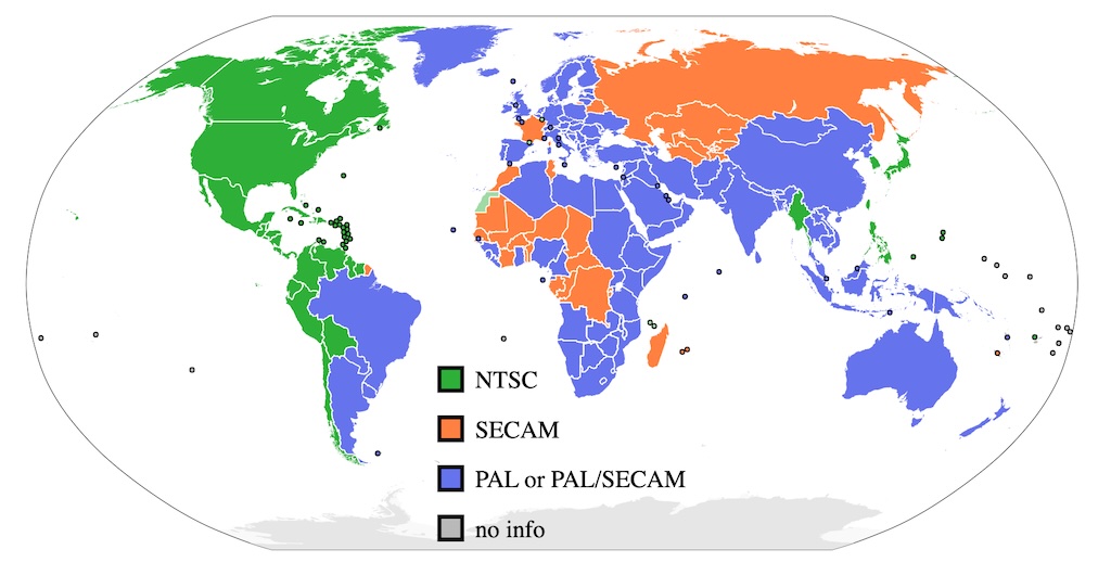 Back in the day, computers would typically connect to TV sets or dedicated monitors using either modulated RF, composite (sometimes with separate chroma/luma, also known as S-Video), or RGB video and encode the signals using either NTSC in the US and some Americas, PAL or PAL/SECAM in the rest of the world. These video standards are derived from the country’s electrical power frequencies. The US uses 110V at 60Hz, NTSC video runs at 30 frames per second, while most of the world uses 220V at 50Hz and PAL at 25 frames per second.