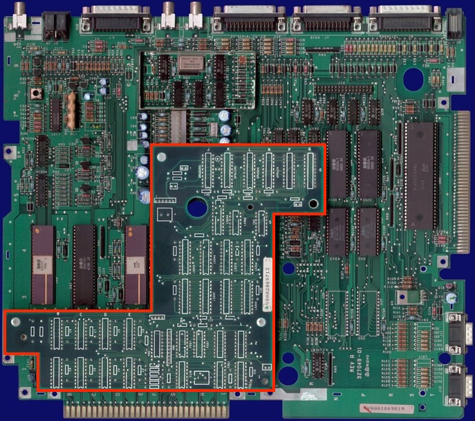 An NTSC Amiga 1000 motherboard with the WCS daughterboard