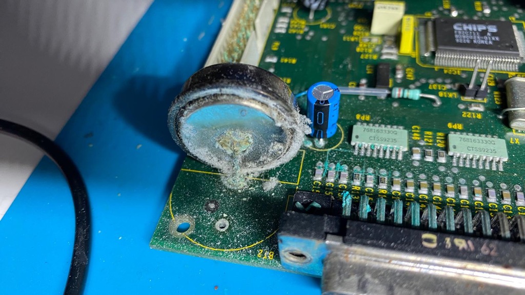 Time to connect SyQuest to the parallel port of the A3020 and get it up and running. When I ran the !BootSparQ tool for the first time, it didn’t find the drive. Weird. The location of the parallel port on the motherboard is near the battery and was heavily corroded—time to check the continuity of all the traces coming from the parallel port.
