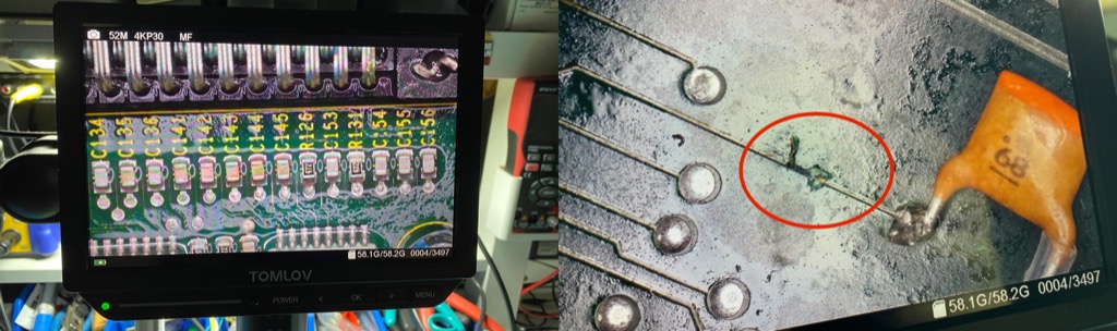 Battery leaks can be hazardous; they often damage items that are far from the battery and not visible to the naked eye. Sure enough, with the help of the multimeter and the microscope, I found plenty of broken traces, more than I would imagine. Look at this broken trace on the back of the PCB.