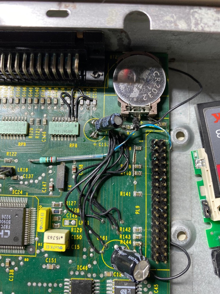 To fix the corroded traces, I used bodge wires. I also replaced the original battery with a CR2032 battery holder and a diode to prevent the CR2032 from charging, and the floppy drive connector. The result isn’t pretty, but it works.